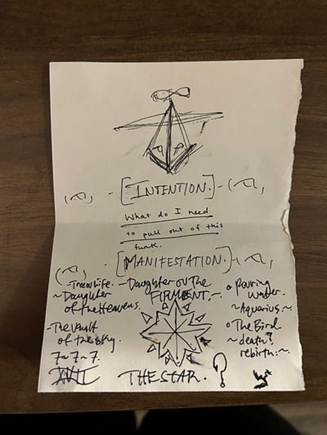 1. First I draw my sigil, a way for me to focus and enter into a flow state, open a “container” to conduct the reading — then I write the name of the one who seeks guidance. Then I ask the querent to set an [Intention], something you are working on, or would like additional guidance on, something top of mind. Then I’ll have the querent write it on the page, in their own wording, as a type of “spell” they cast.