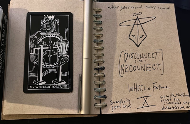 2. For my New Years card at the start of 2024 I pulled the Wheel of Fortune. It reminded me of the reoccurring nature of the world: cycles, seasons, circles, sometimes you go round enough to go up in a spiral. What goes around comes around. “Going with the flow” has been a good guiding mindset so far this year. Seeds and plans I planted years ago now coming to fruition.