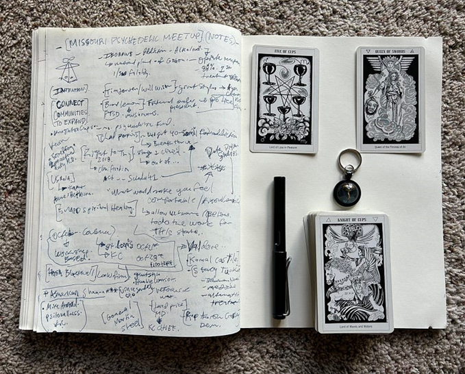 A journal entry and Tarot card spread from a Missouri Psychedelic Meetup in 2021